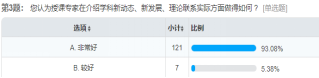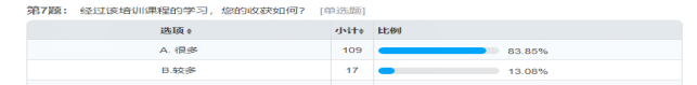 学员们全员完成9次课后测试,平均分80分以上,有3个主题课后测试在90分以上,4个主题培训的平均为在85~90分。培训结束收回课程满意度调查问卷130份,92%以上均对本次培训课程专家的精神状态、专业性、学科前沿动态、学员的启发性和动手能力、授课内容清晰透彻评价非常好。96.93%认为通过培训收获多,其中83.85%的学员认为通过培训收获很多。