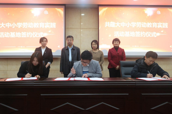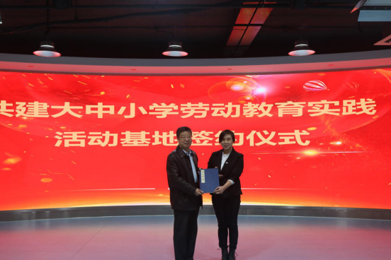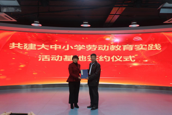 签约仪式上,北京师范大学天津附属中学姜腾主任、温家房子小学德育处王婷主任与我校团委书记、学生处张鑫副处长共同签署协议。随后,杨伟云校长和张慧校长分别为我校颁授“劳动教育实践基地”牌匾。