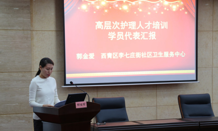 华苑街社区卫生服务中心杨青书记代表南开区华苑工作坊培训基地发言,张颖医生和郭金爱护士长作为学员代表发言。李刚副处长、王庆副校长、叶波副总裁、刘冬莹处长共同给学员颁发培训结业证书。