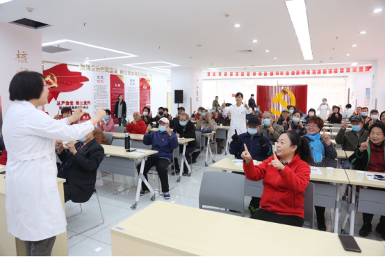 宣讲活动的第三个环节是马连娣老师讲解预防阿尔茨海默症的手指操,王妍老师协助操演。在马老师清晰讲解和热烈带动下,每位居民都激情饱满的参与了进来,大家一起手、口、脑并用,活动气氛积极热烈,把宣讲活动推向了高潮。