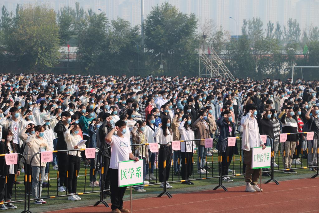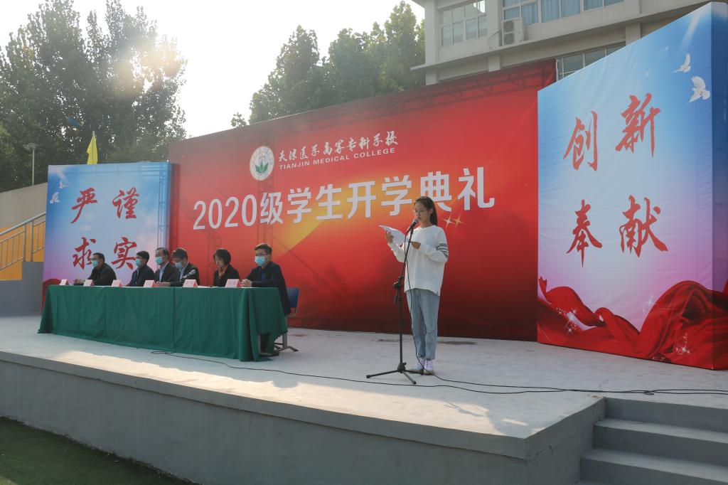 在开学典礼的重要组成——医学生宣誓环节,在学生工作处邢琳老师的带领下,2020级全体新生举起了右拳,庄严的医学生誓词在此时此刻显得是如此厚重,“健康所系,性命相托”不断在操场中回响,表达了每一名医学生对未来岗位的信仰和信心。