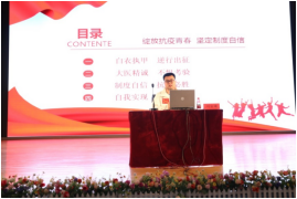 15:20分,在热烈的掌声中抗疫思政课正式开始。郭珺首先介绍了在武汉抗疫期间医护工作者的艰辛故事,以她和女儿的眷恋深情对比凸显出大任在前,使命所在的气魄,白衣执甲、闻令而动,不畏艰难,英勇向前。刘富康讲述了自己逆行出征,冲锋在前的故事,通过分享自己在援鄂一线面临的考验和经历的成长,鼓励同学们在青春的年纪做不凡的事,担负起新时代中国青年的责任与使命。郭珺和刘富康以感人的故事,深厚的情怀,恳切的叙述引得阵阵掌声,在热烈的气氛中抗疫思政巡讲课进入尾声。