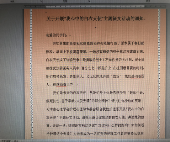 为培养护生“敬佑生命、救死扶伤、甘于奉献、大爱无疆”的职业精神,专委会联合学校护理系于2020年2月17日—3月26日开展“我心中的白衣天使”主题征文活动,紧紧围绕当前抗击疫情的实录、见闻、事迹等,生动讲述医护人员的故事,讴歌和赞颂英勇战斗在防疫一线的护理工者。此次活动得到了护理系领导及各班辅导员的大力支持,经过推荐选拔,截至3月26日共收集2018、2019级学生226篇征文,目前正在由专委会15位临床一线的老师进行批阅,将分别评选出一等奖10篇;二等奖20篇;三等奖30篇;优秀奖50篇,其余为鼓励奖,优秀作品计划在5.12护士节期间组织优秀作品分享会,届时将邀请在本次抗击疫情中战斗在一线的优秀护士与获奖同学共同分享经历体会。