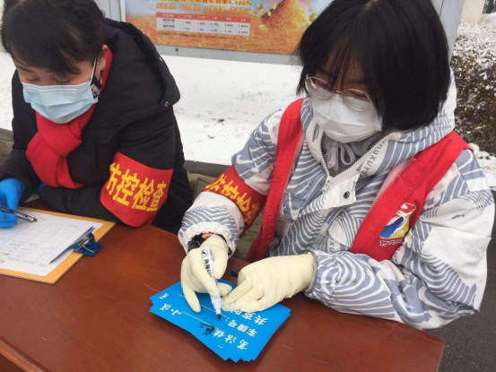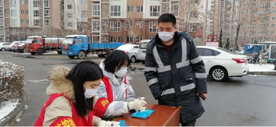 张晓畅同学从2月2日一直在自己所在的社区(天津市津南区葛沽镇慈水园二区南门)进行小区车辆登记并发放车牌,给进出小区车辆级行人测量体温,发放预防新型冠状病毒的宣传页等工作,她说道:“作为一名医学生虽然现在不能去前线做贡献,但能有机会在基层贡献出小小的一份力量也是感觉非常开心的。在志愿过程中,有热心的居民给送来了热水还有水果,可能东西并不贵重,但这份心意让我很感动。”