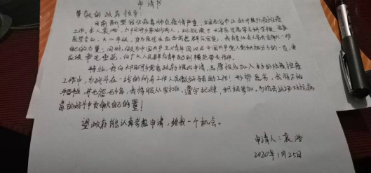 在湖北疫情日趋严重的关口,袁浩同学毅然决然的递交了自己的请愿申请书。